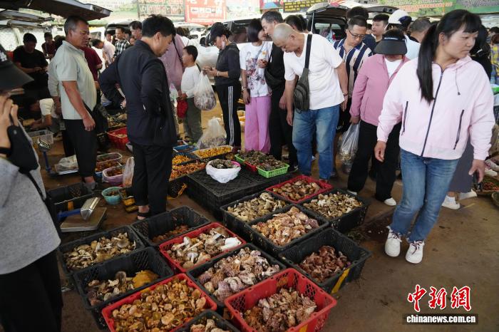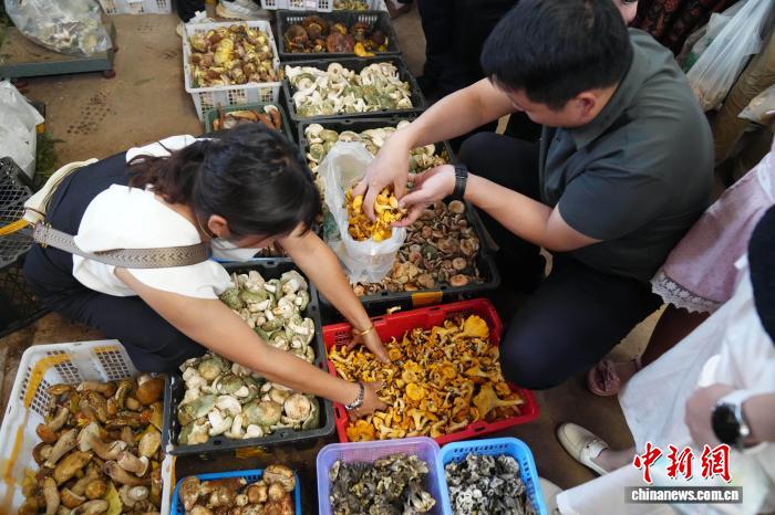8月30日,昆亮市的云北木火花家死菌交往要旨人气呼呼兴旺,没有少市平易近哄骗周终前去推销家死菌,品味节令厚味。图为市平易近收购鸡油菌。中新社记者 刘冉阳 摄